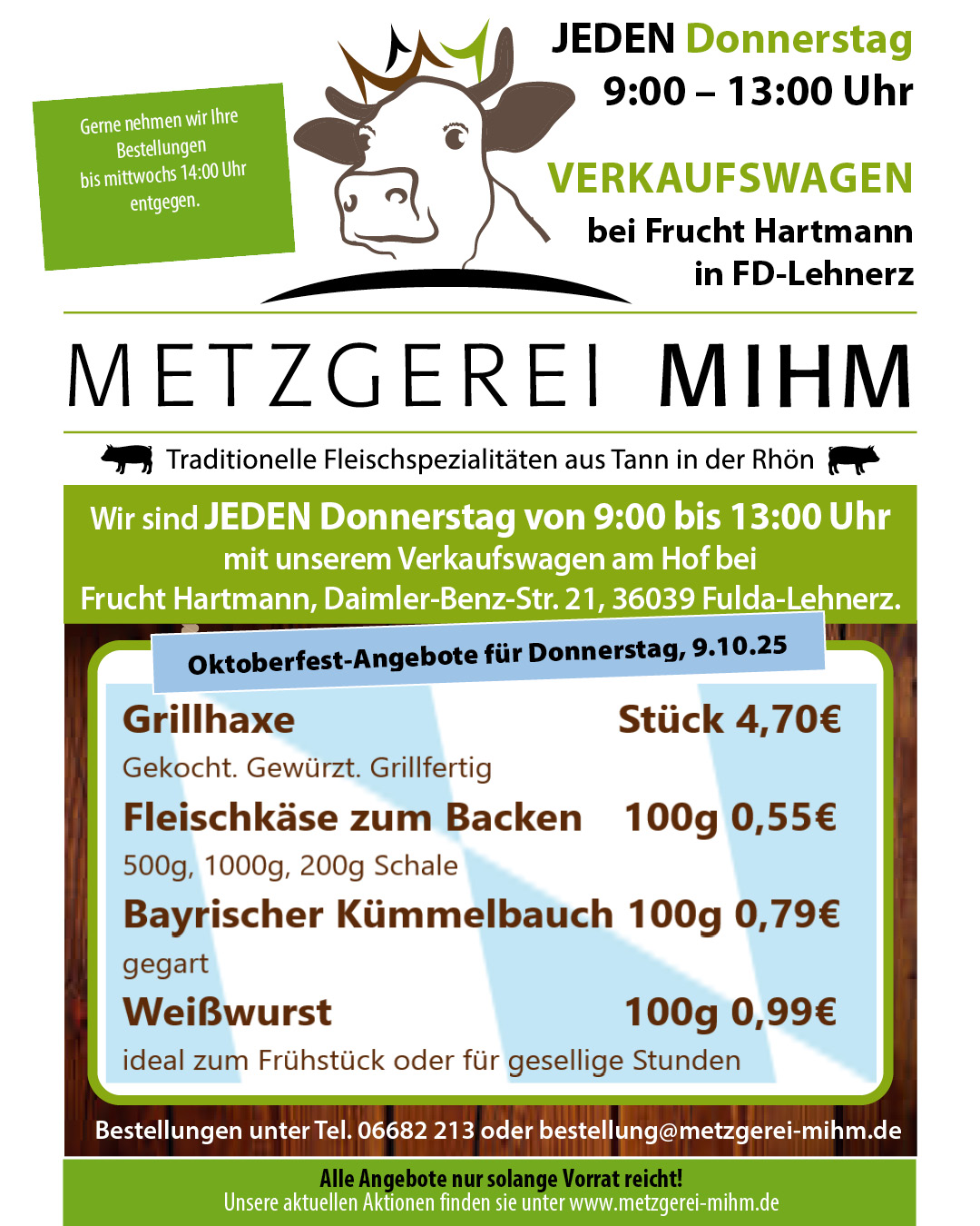 Gültig für Donnerstag, 9. Oktober 2025 Jeden Donnerstag von 9 Uhr bis 13 Uhr fahren wir mit ausgewählten Spezialitäten in unserem Verkaufswagen auf den Hof von Frucht