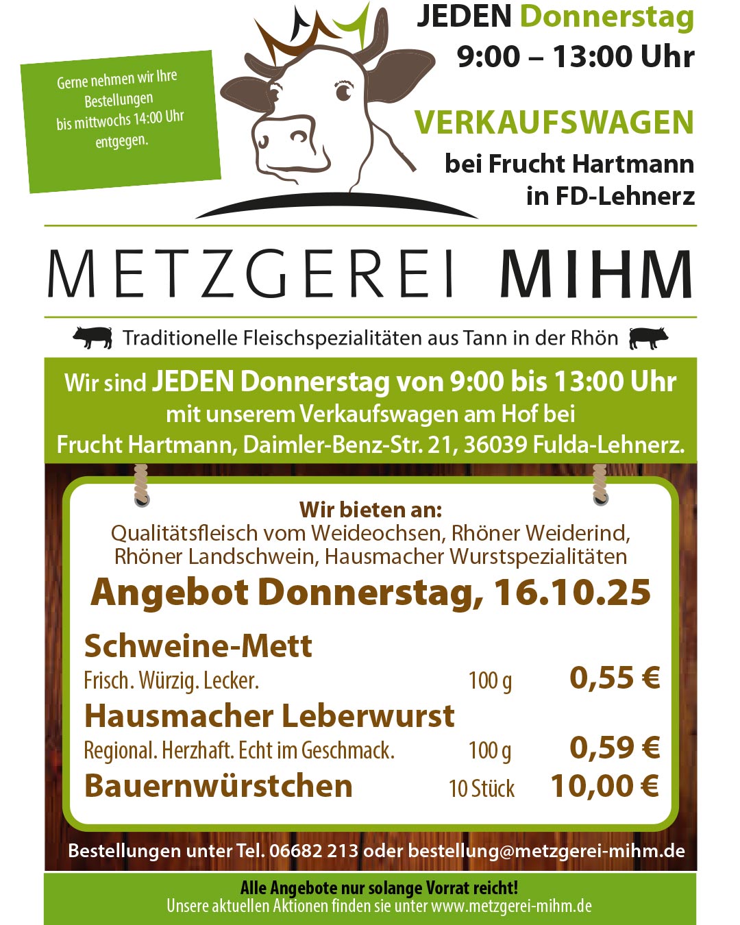 Gültig für Donnerstag, 16. Oktober 2025 Jeden Donnerstag von 9 Uhr bis 13 Uhr fahren wir mit ausgewählten Spezialitäten in unserem Verkaufswagen auf den Hof von Frucht