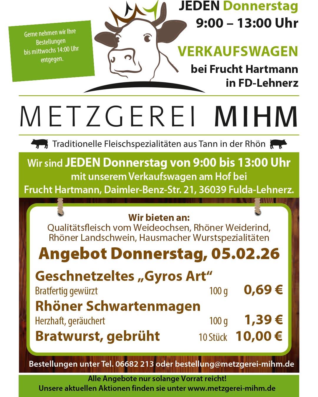 Gültig für Donnerstag, 5. Februar 2026 Jeden Donnerstag von 9 Uhr bis 13 Uhr fahren wir mit ausgewählten Spezialitäten in unserem Verkaufswagen auf den Hof von Frucht