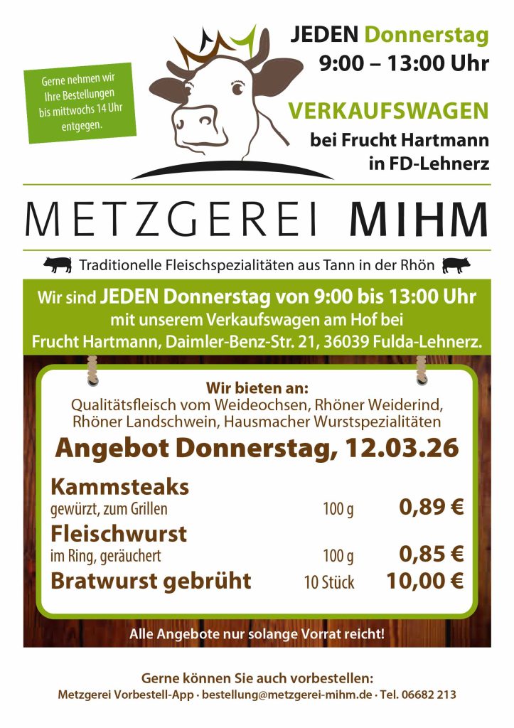 Gültig für Donnerstag, 12. März 2026 Jeden Donnerstag von 9 Uhr bis 13 Uhr fahren wir mit ausgewählten Spezialitäten in unserem Verkaufswagen auf den Hof von Frucht Hartmann in Fulda. Kommen Sie vorbei und lassen Sie sich nicht die leckeren Angebote entgehen!