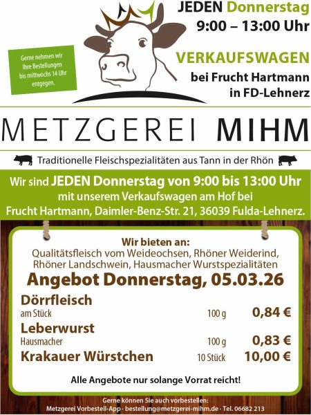 Gültig für Donnerstag, 5. März 2026 Jeden Donnerstag von 9 Uhr bis 13 Uhr fahren wir mit ausgewählten Spezialitäten in unserem Verkaufswagen auf den Hof von Frucht