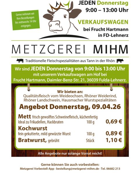 Gültig für Donnerstag, 9. April 2026 Jeden Donnerstag von 9 Uhr bis 13 Uhr fahren wir mit ausgewählten Spezialitäten in unserem Verkaufswagen auf den Hof von Frucht