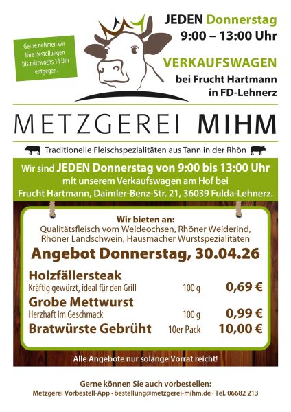 Gültig für Donnerstag, 30. April 2026 Jeden Donnerstag von 9 Uhr bis 13 Uhr fahren wir mit ausgewählten Spezialitäten in unserem Verkaufswagen auf den Hof von Frucht