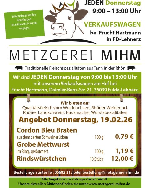 Gültig für Donnerstag, 19. Februar 2026 Jeden Donnerstag von 9 Uhr bis 13 Uhr fahren wir mit ausgewählten Spezialitäten in unserem Verkaufswagen auf den Hof von Frucht