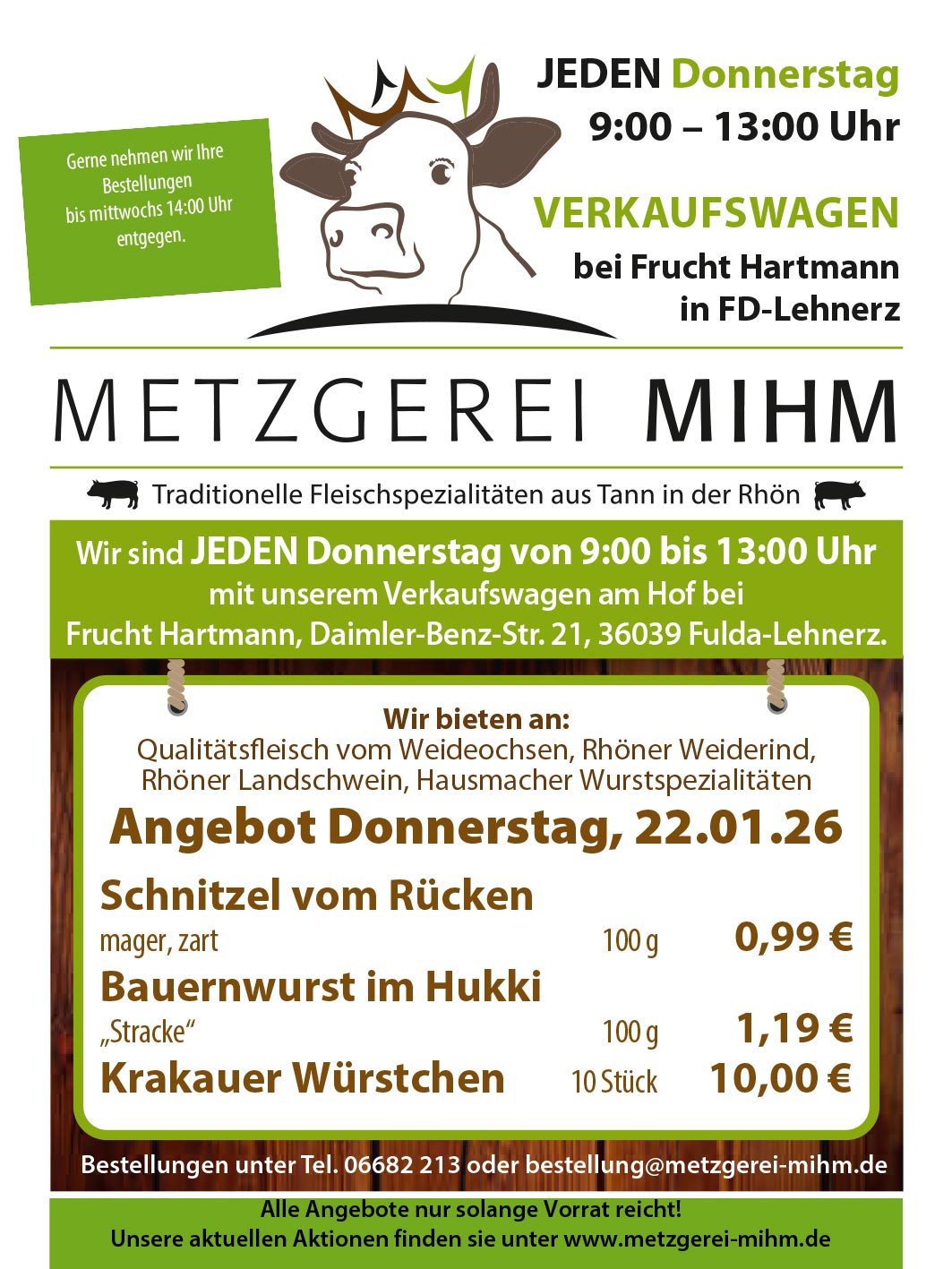 Jeden Donnerstag von 9 Uhr bis 13 Uhr fahren wir mit ausgewählten Spezialitäten in unserem Verkaufswagen auf den Hof von Frucht Hartmann in Fulda. Kommen Sie vorbei und lassen Sie sich nicht die leckeren Angebote entgehen!
