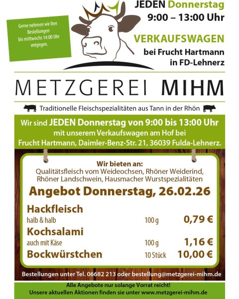 Jeden Donnerstag von 9 Uhr bis 13 Uhr fahren wir mit ausgewählten Spezialitäten in unserem Verkaufswagen auf den Hof von Frucht Hartmann in Fulda. Kommen Sie vorbei und lassen Sie sich nicht die leckeren Angebote entgehen!
