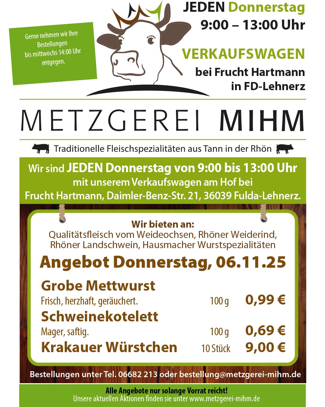 Jeden Donnerstag von 9 Uhr bis 13 Uhr fahren wir mit ausgewählten Spezialitäten in unserem Verkaufswagen auf den Hof von Frucht Hartmann in Fulda. Kommen Sie vorbei und lassen Sie sich nicht die leckeren Angebote entgehen!