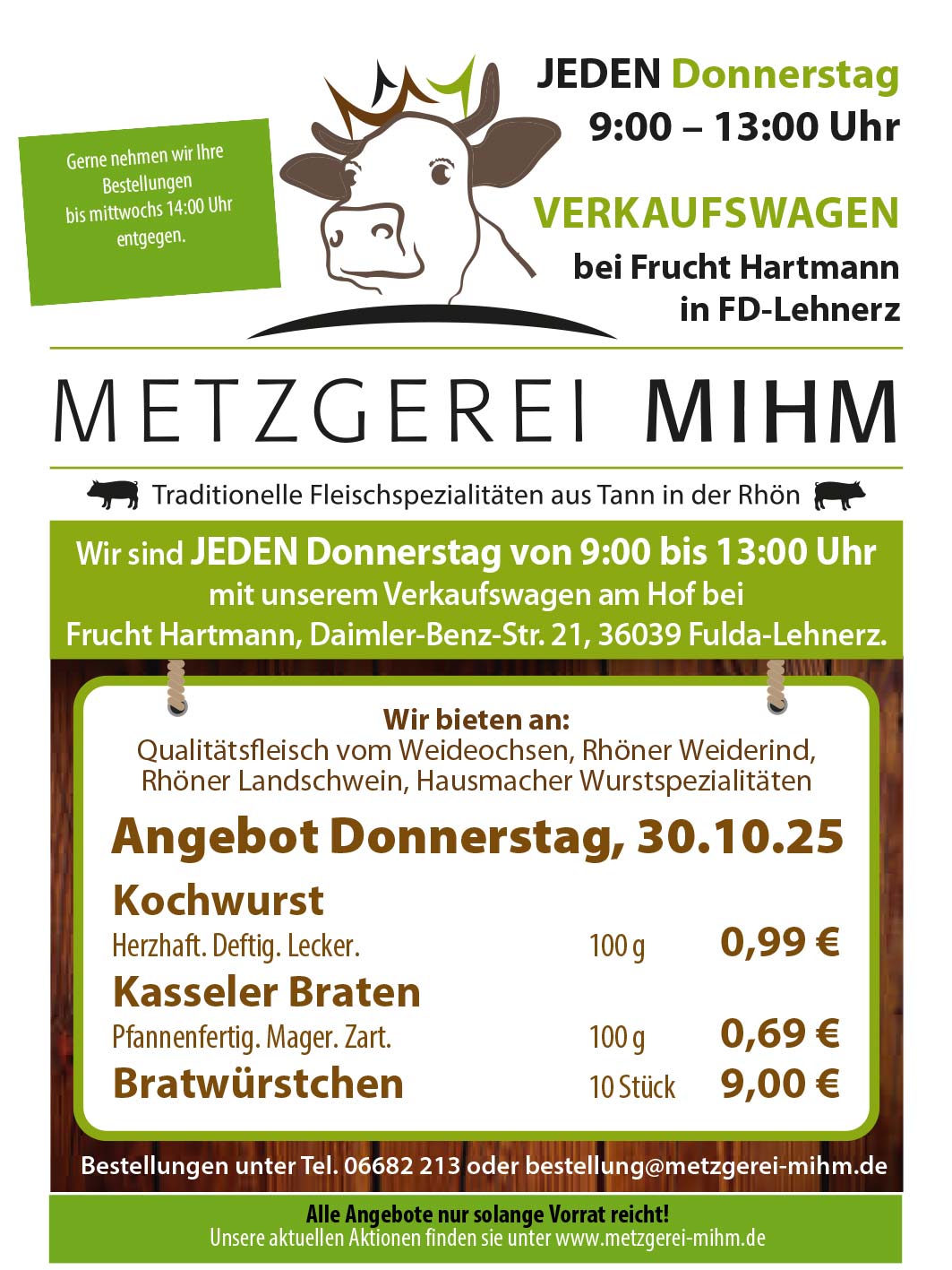 Jeden Donnerstag von 9 Uhr bis 13 Uhr fahren wir mit ausgewählten Spezialitäten in unserem Verkaufswagen auf den Hof von Frucht Hartmann in Fulda. Kommen Sie vorbei und lassen Sie sich nicht die leckeren Angebote entgehen!