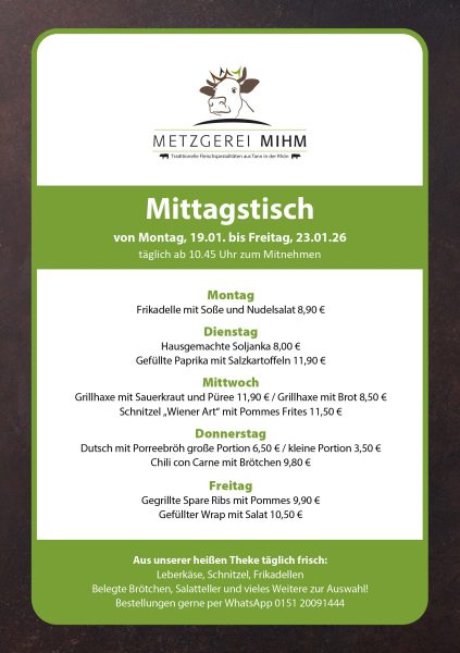 Von Montag, 19. Januar 2026 bis Freitag, 23. Januar 2026.Täglich von 10.45 Uhr zum Mitnehmen.