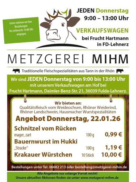 Gültig für Donnerstag, 22. Januar 2026 Jeden Donnerstag von 9 Uhr bis 13 Uhr fahren wir mit ausgewählten Spezialitäten in unserem Verkaufswagen auf den Hof von Frucht